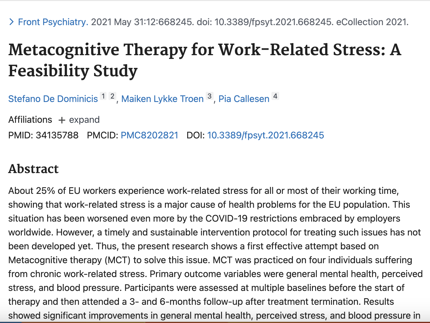 Forskningsartikel udgivet i tidsskriftet Frontiers in Psychiatry: “Metacognitive Therapy for Work-Related-Stress: A Feasibility Study” af Stefano De Dominicis, Maiken Lykke & Pia Callesen